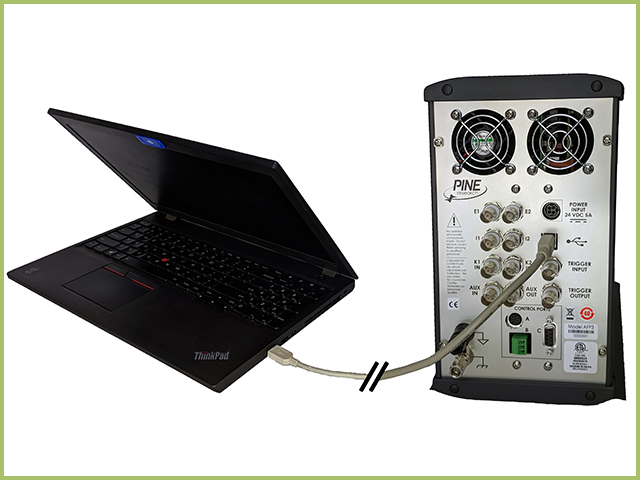 Pine Research potentiostats connect to a computer using a USB cable supplied with the instrument (Type A male to Type B female USB cable). The USB port on the accompanying computer must be capable of USB 2.0 (or better) data transfer rates. See figures below for examples of a laptop connected to a Pine Research WaveDriver series and WaveNow series potentiostat.