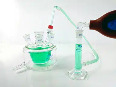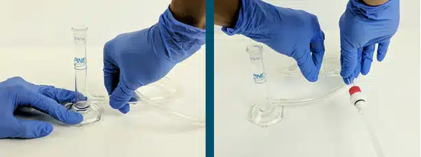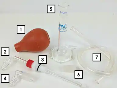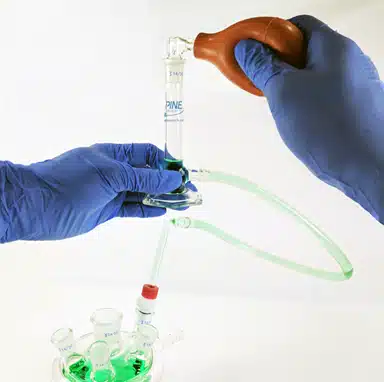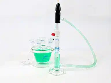 Attach the Pipette Bulb to a greased 14/20 Glass Adapter. Squeeze the Pipette Bulb to deflate it, and continue holding it in its deflated state. With your other hand, raise the External Reservoir to the highest point possible with respect to the electrochemical cell; the Flexible Tube Salt Bridge should be nearly vertical. Attach the deflated Pipette Bulb with 14/20 Glass Adapter to the 14/20 port of the External Reservoir and slowly remove your hand from the bulb. This will apply suction (negative pressure) at the 14/20 port of the External Reservoir and electrolyte liquid should enter the External Reservoir from the electrochemical cell.