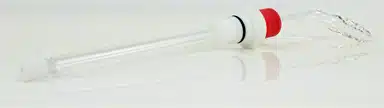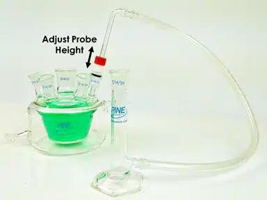 Mate the Fritted Tube Probe onto the 14/20 port of a glass electrochemical cell. Adjust the height of the Fritted Tube Probe by untightening the red cap of the 14/20 PTFE Probe Adapter and sliding the Fritted Tube Probe into place; the tip of the Fritted Tube Probe should be at least 1 inch below the sample liquid. Tighten the red cap when the desired height is reached.